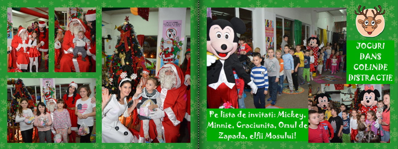 Va asteptam cu multe surprize, colinde, jocuri, dans si cu o atmosfera specifica Sarbatorilor de Iarna! Pe lista invitatiilor se afla Mickey si Minnie Mouse, Craciunita, Omul de zapada, elfii Mosului si mult asteptatul Mos Craciun care va aduce cadouri pentru fiecare copil!